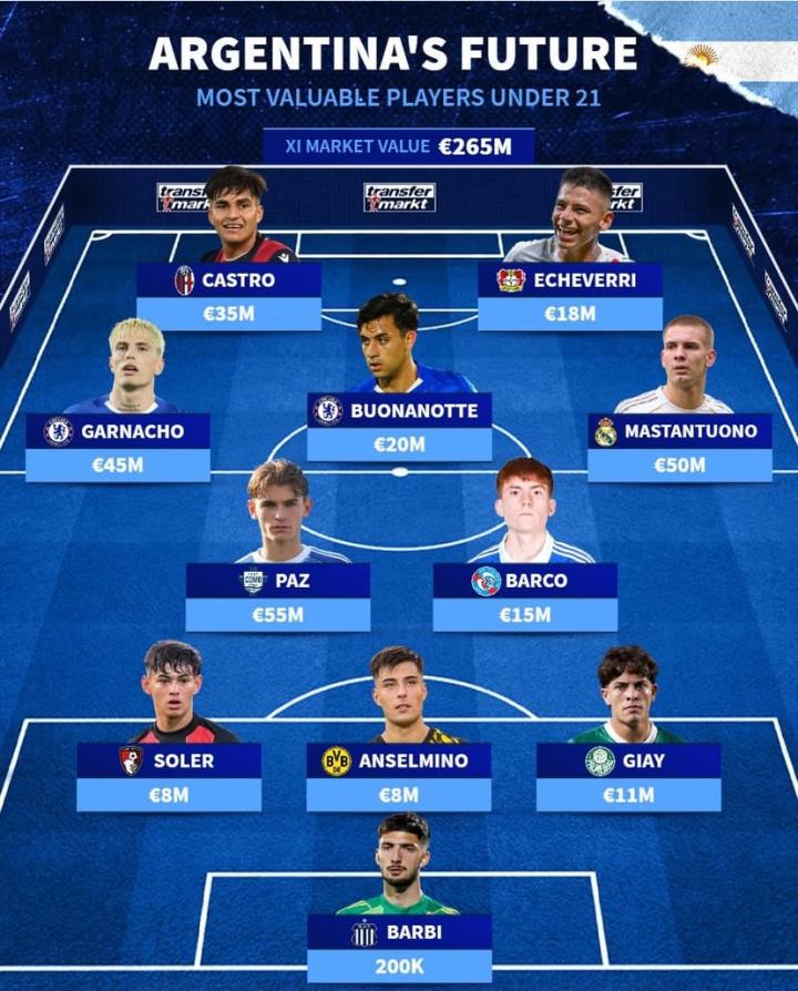 德国转会市场网站公布的阿根廷最贵U21阵容: